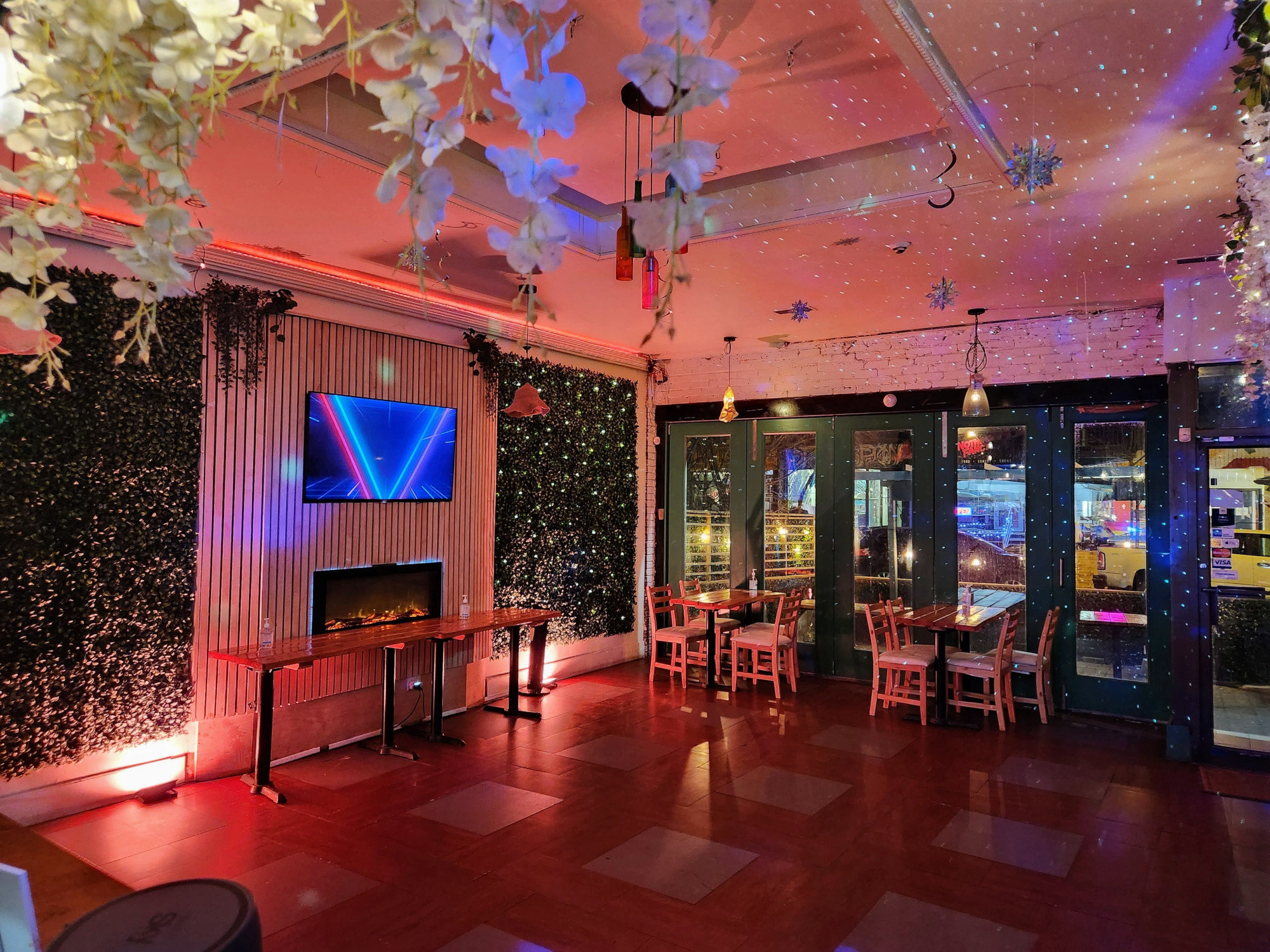 Comfortably accommodating 40+ guests indoors (up to 50 total), the space features dynamic party lights to set the mood, a large 55-inch TV for presentations or entertainment, and a cozy fireplace for cooler evenings. Extend your celebration outdoors with our optional vibrant patio space (weather permitting).