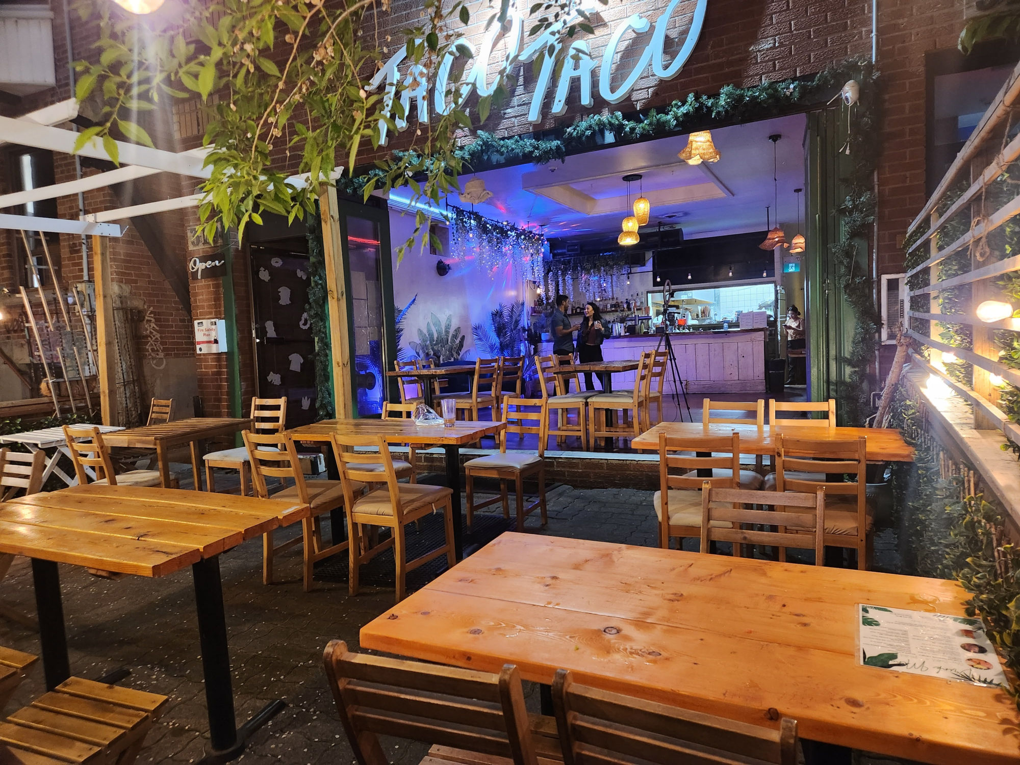 Step outside and enjoy our charming, sunlit patio—an inviting extension of the TacoTaco dining experience. Nestled in the heart of Kensington Market, our patio offers a relaxed, open-air atmosphere surrounded by greenery and warm wood accents.